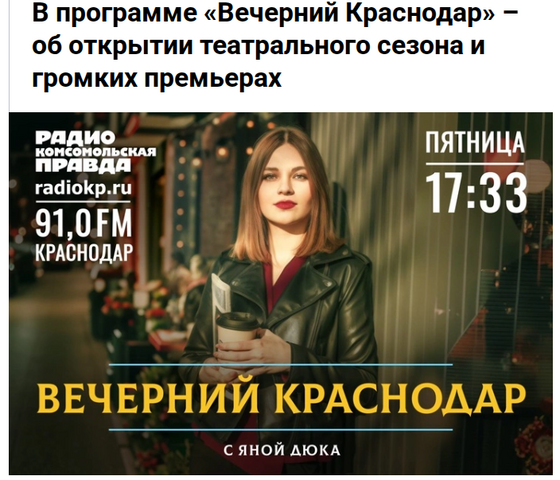 В гостях у «Вечернего Краснодара» – заслуженная артистка Кубани Карина Петровская. Обсуждаем ее бенефис и главную роль в блистательной оперетте «Ханума» на сцене Музыкального театра. Говорим о творческом пути и главной премьере сезона. Слушать эфир