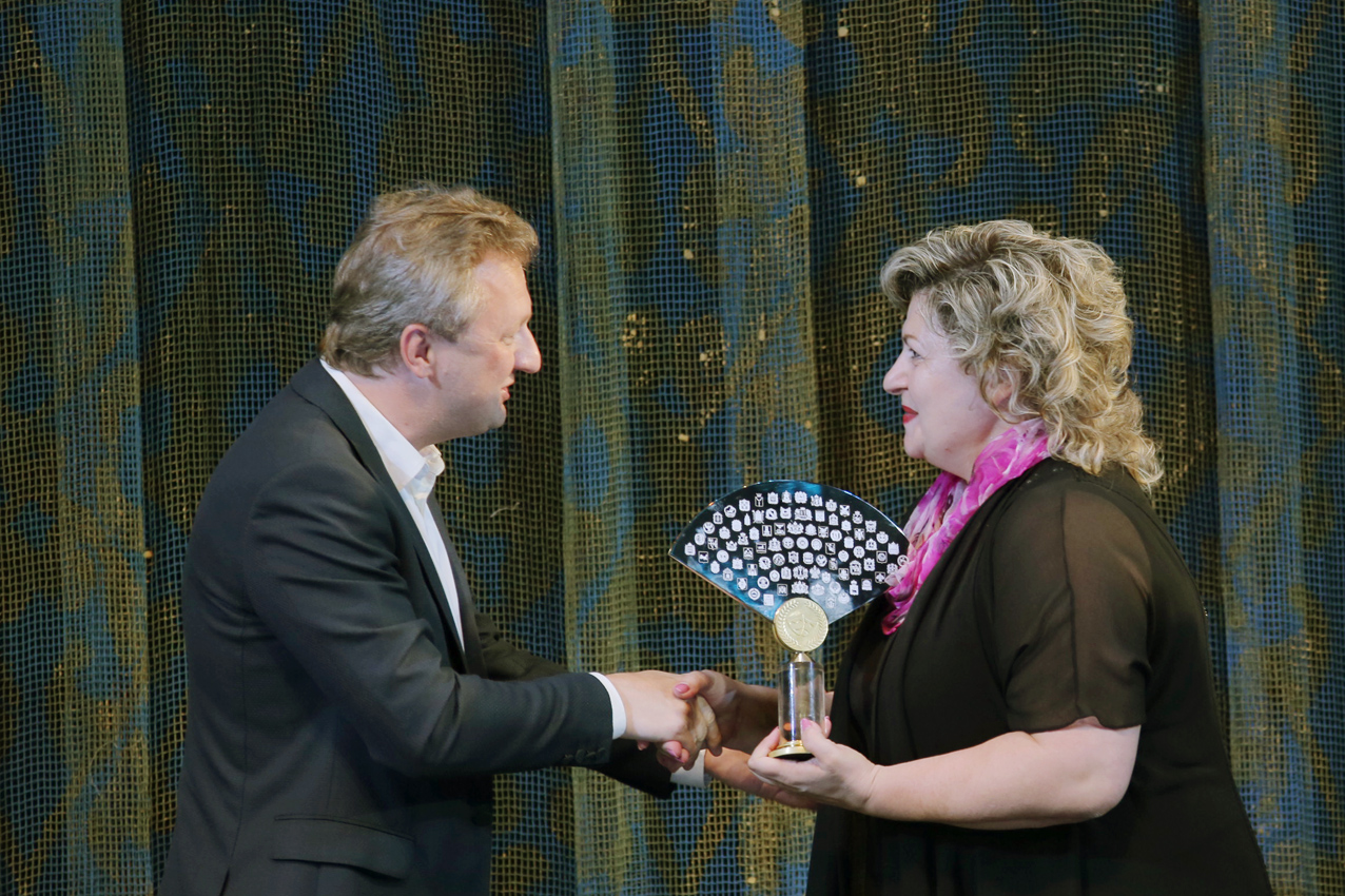 Принимала театральный символ от астраханских коллег директор Краснодарского академического театра драмы им. Максима Горького Ирина Репина: